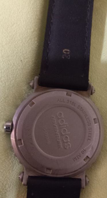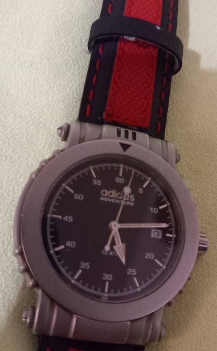 Model Adidas Adventure 10- 0009s, točnije vintage komad iz 1990-ih ili ranih 2000-ih. Broj modela 00- 009s. Ovo je analogni sat s kvarcnim mehanizmom, okruglim kućištem od nehrđajućeg čelika i crnim brojčanikom. Često uključuje jednosmjerno rotirajući okvir i funkciju indikatora datuma.