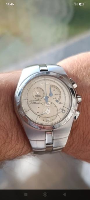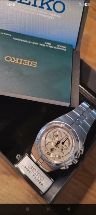 Prodajem Seiko Arctura SNL009 muški sat, originalan kronograf s kompleksnim brojčanikom. Kućište je od nehrđajućeg čelika, kao i narukvica s kombinacijom mat i poliranog završnog sloja. Brojčanik u svijetloj bež boji ima tri subdial-a, a sam sat ima sportski i moderan dizajn karakterističan za Arctura seriju.