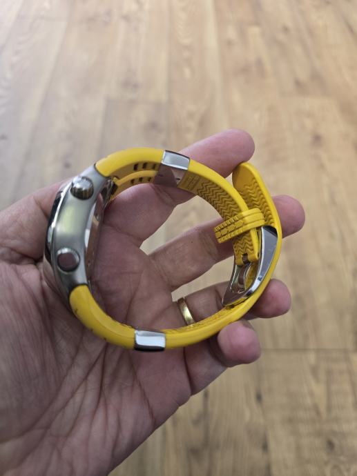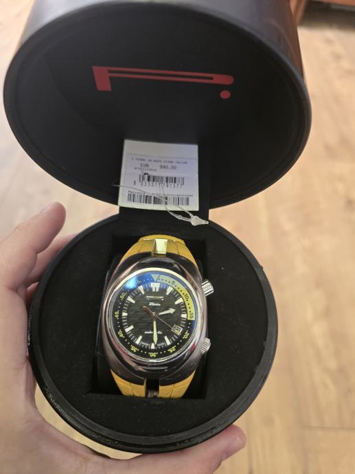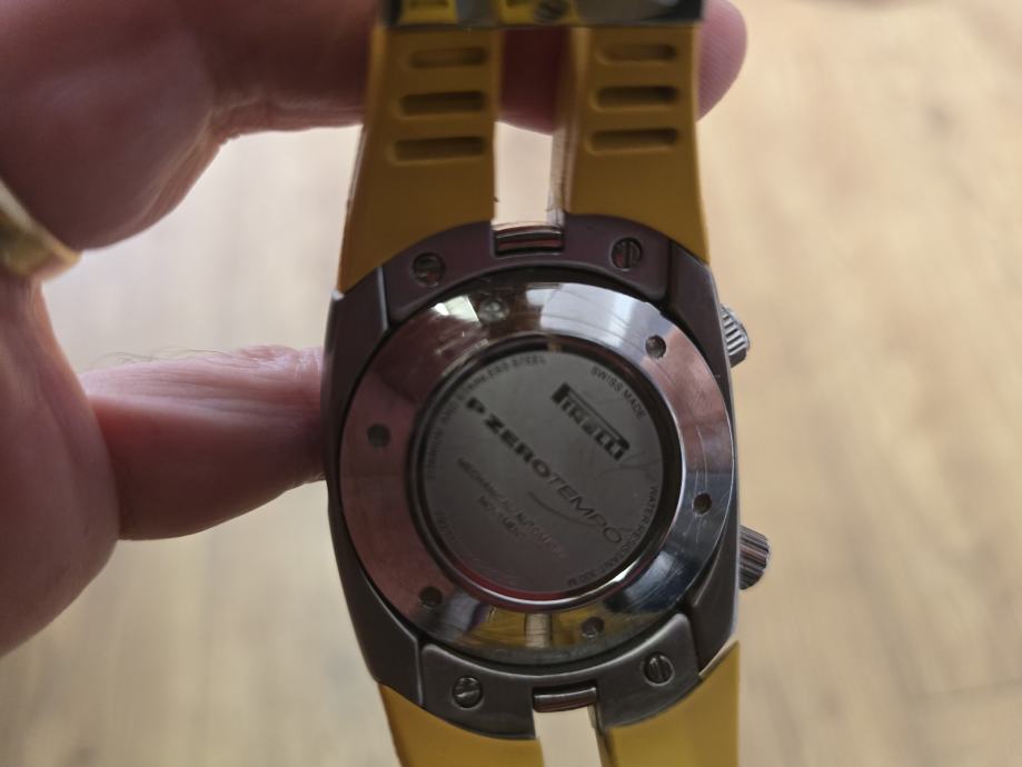 Prodajem automatski sat Pirelli Pzero Diver, zanimljiv model koji kombinira sportski dizajn s automatskim mehanizmom. Kućište je izrađeno od nehrđajućeg čelika, narukvica je žuta gumena, s teksturom inspiriranom automobilskim gumama, kopča je od nehrđajućeg čelika.