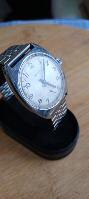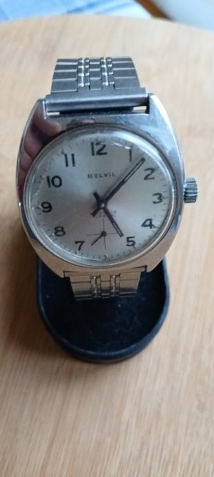 Belvil 17 jewels incanloc vintage mehanicki sat ispravan. All stainless steel kuciste dim 35x35 mm bez krunice i lugova. Da na pleksiju nema par crtica bio u odlicnom stanju.narukvica metalna također vintage u punoj duljini