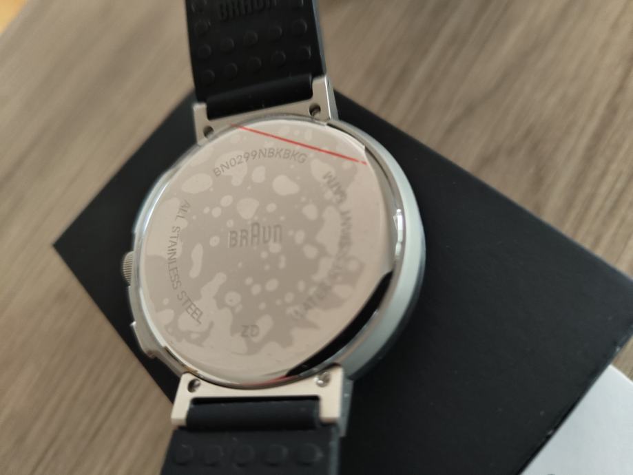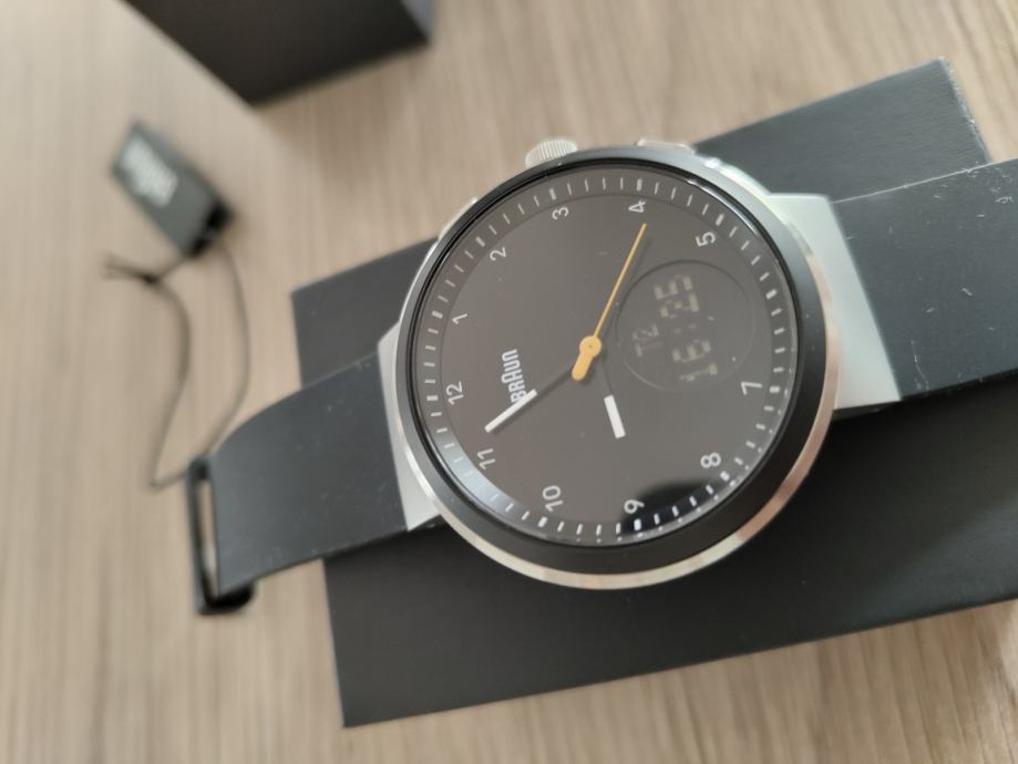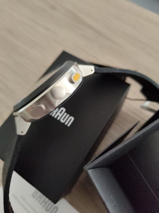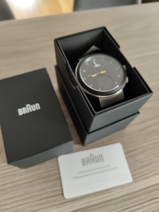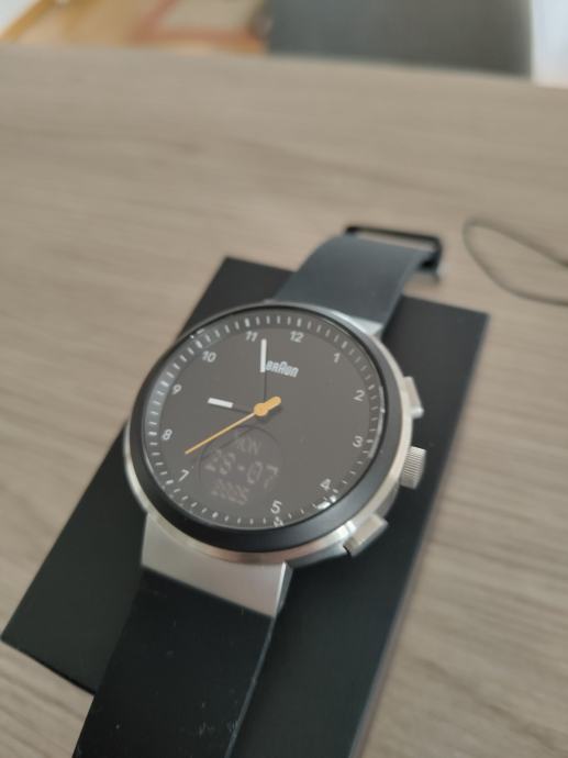 Braun analogni kvarcni sat s digitalnim zaslonom s kalendarom, brojačem koraka, kronometrom i sekundarnim prikazom vremena. Crni silikonski gumeni remen, kućište od nehrđajućeg čelika 45 mm. Dobiven kao poklon te nošen samo nekoliko puta.