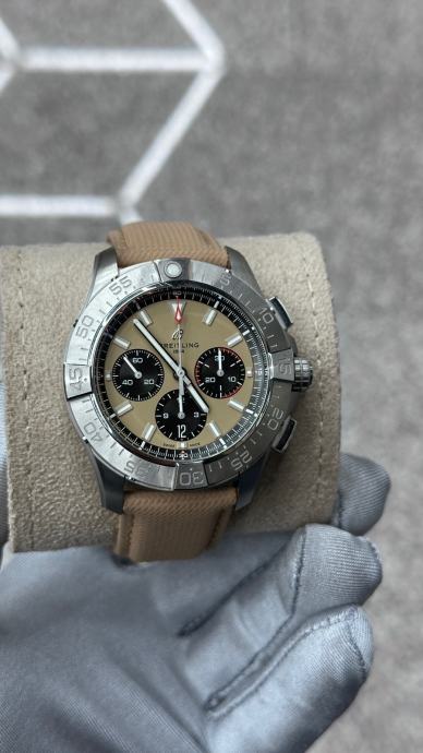Na prodaju je **potpuno nova, nenošena** ura **Breitling Avenger B01 Chronograph 44**, s **važećim tvorničkim jamstvom do 2034. godine**.