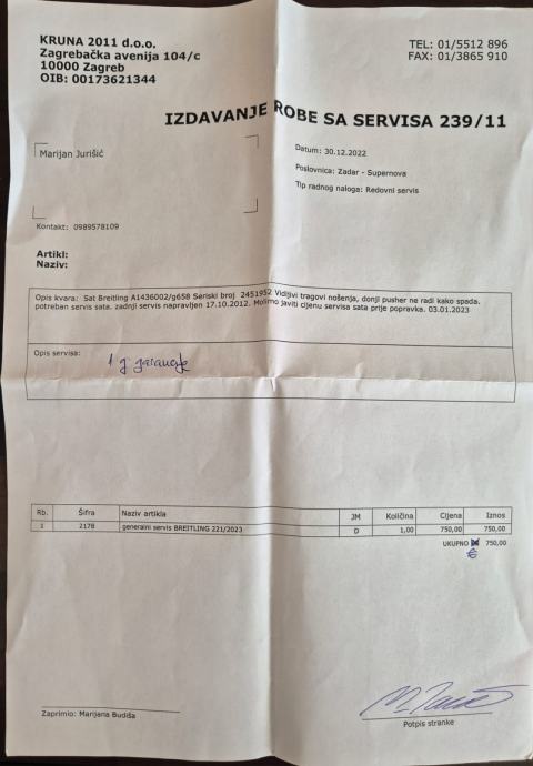 Sat je kupljen u ovlaštenoj prodaji i dolazi s kompletnom dokumentacijom (full set).
