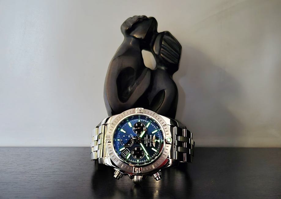 Prodajem Breitling Chronomat s plavim dialom i crnim subdialovima, sa svim papirima I kutijom, 9/2021 god. Novije godište B01 i bez potrebe za servisom godinama, narukvica dostatna za zglob 19 cm.