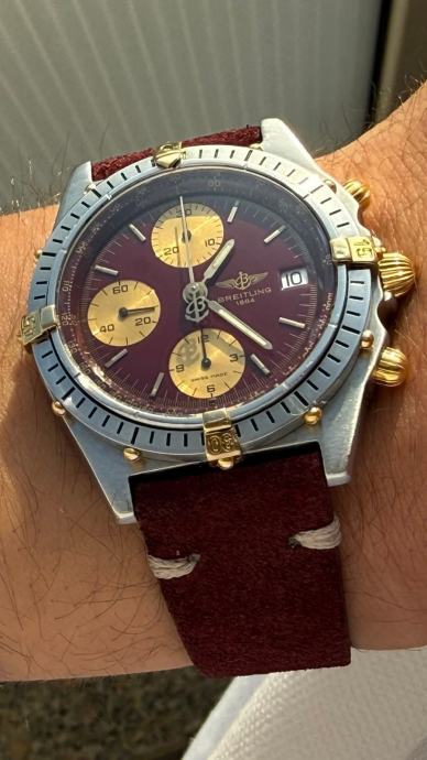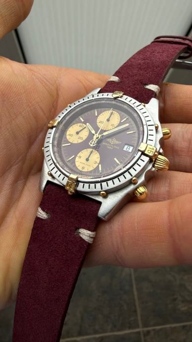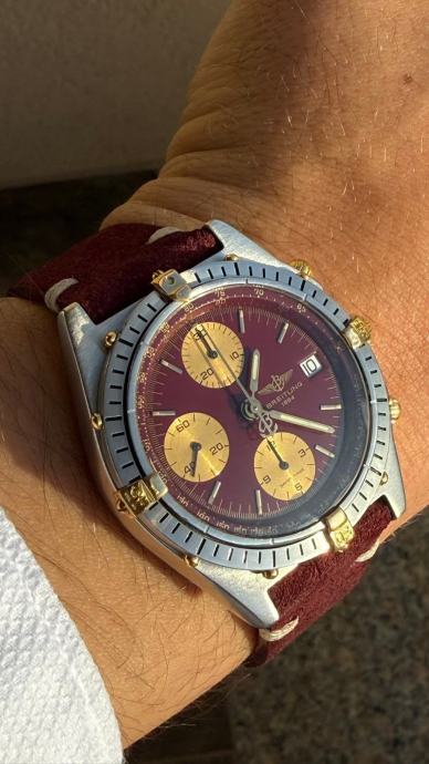 Predivan vintage Breitling u odličnom stanju s vrlo rijetkim Burgundy crvenim brojčnikom. Automatski mehanizam. Kompletan servis napravljen 19.09.2025. godine. Sat dolazi uz certifikat autentičnosti, The Watch Register izvadak, potvrda testa vodootpornosti. Bez originalne kutije i papira. Burgundy kožna narukvica od brušene kože Vera pelle (EU Made).