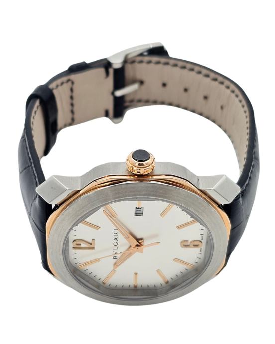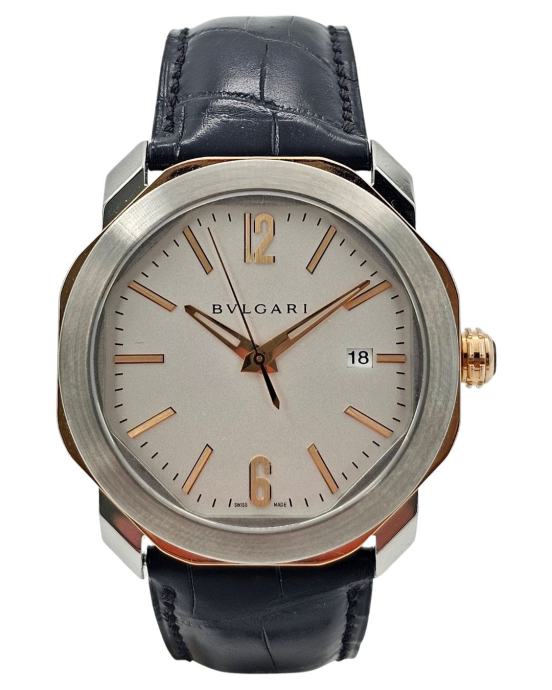 Bvlgari Octo je više od sata – to je umetničko delo na vašem zglobu. Karakteriše ga prepoznatljivo osmougaono kućište koje spaja italijansku estetiku i švajcarsku preciznost. Ovaj model dolazi sa automatskim mehanizmom, kućištem od nerđajućeg čelika sa detaljima od roze zlata i kožnim kaišem, što ga čini savršenim za muškarce sa stilom. Jednostavan brojčanik u sivoj boji sa zlatnim markerima dodatno naglašava sofisticiranost. Sat je autentičan, u odličnom stanju i dostupan uz garanciju.