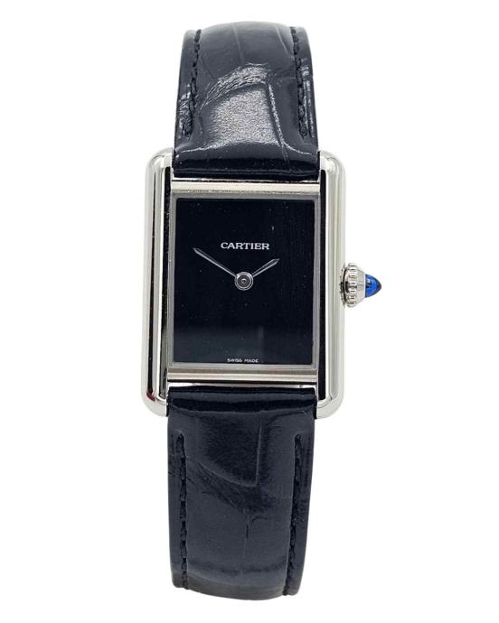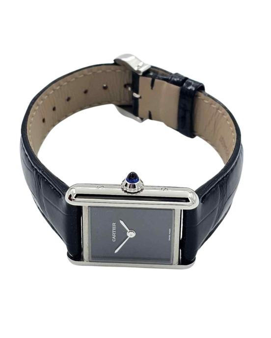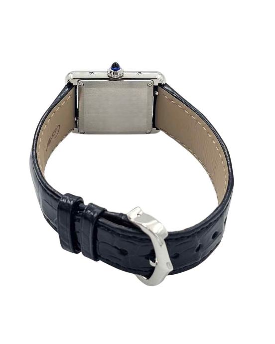 Kućište od nerđajućeg čelika ističe pravougaone proporcije karakteristične za Tank liniju, dok čuvene rimske cifre, plave kazaljke i krunica sa kabohonom pružaju autentičan Cartier identitet. Minimalistički brojčanik daje ovom modelu savršenu ravnotežu između modernog i klasičnog izgleda.