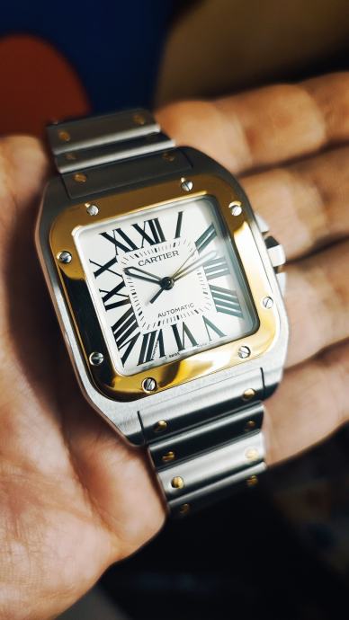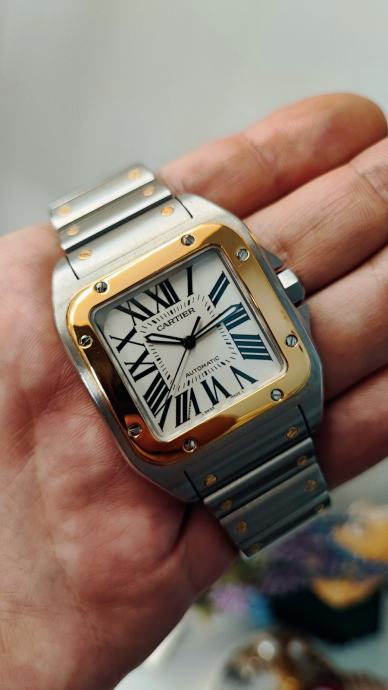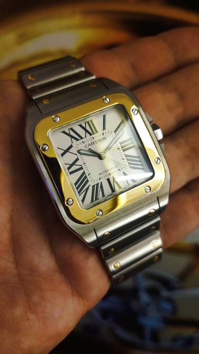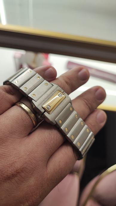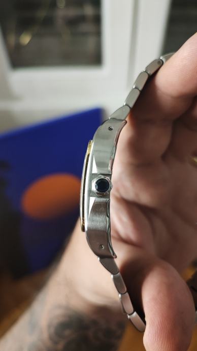 Prodajem Cartier Santos 100 xl, čelik/18k zlato u punom setu, dakle kutija, papiri, putni etui, set za održavanje, servisna dokumentacija. Sat je prošao kompletan servis u ovlaštenom servisu ( Marli u Zagrebu ) 01.10.2024. te je pod dvogodišnjim jamstvom. Servis je plaćen 870€ s računom na uvid. Narukvica, naravno pune dužine za zglob do 22cm. Sat je u fantastičnom estetskom stanju s minimalnim tragovima korištenja te savršenom radnom stanju. Zamjene me ne zanimaju.