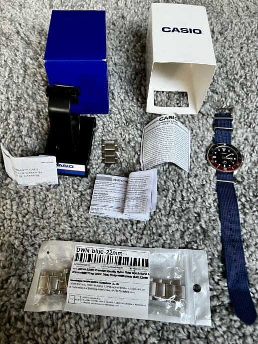 Dolazi s originalnom Casio metalnom narukvicom u punoj dužini i još jednim nato strapom.