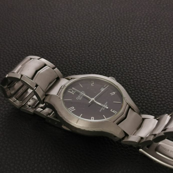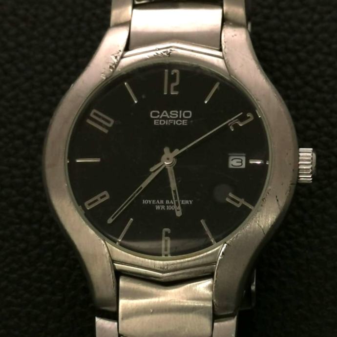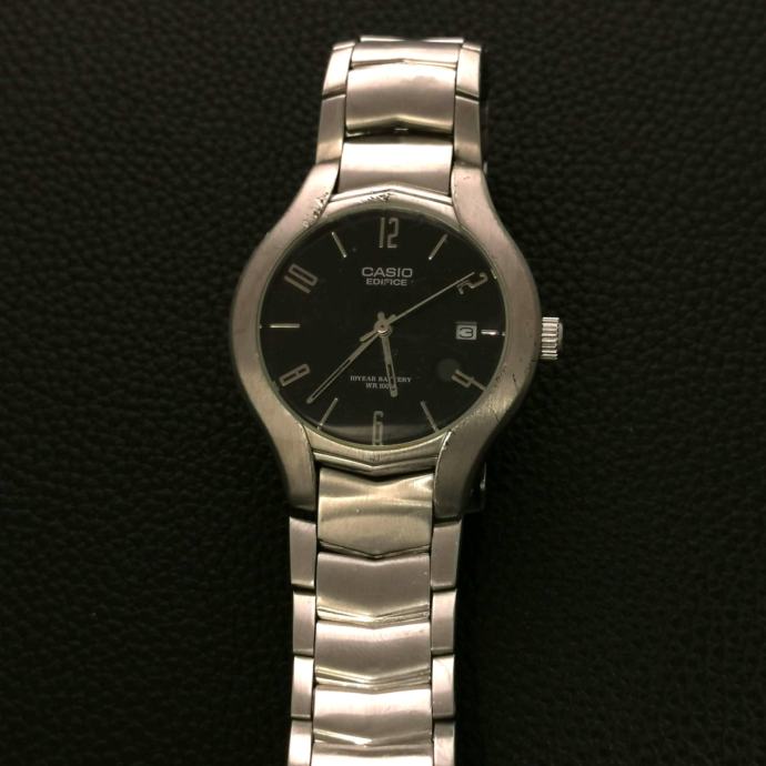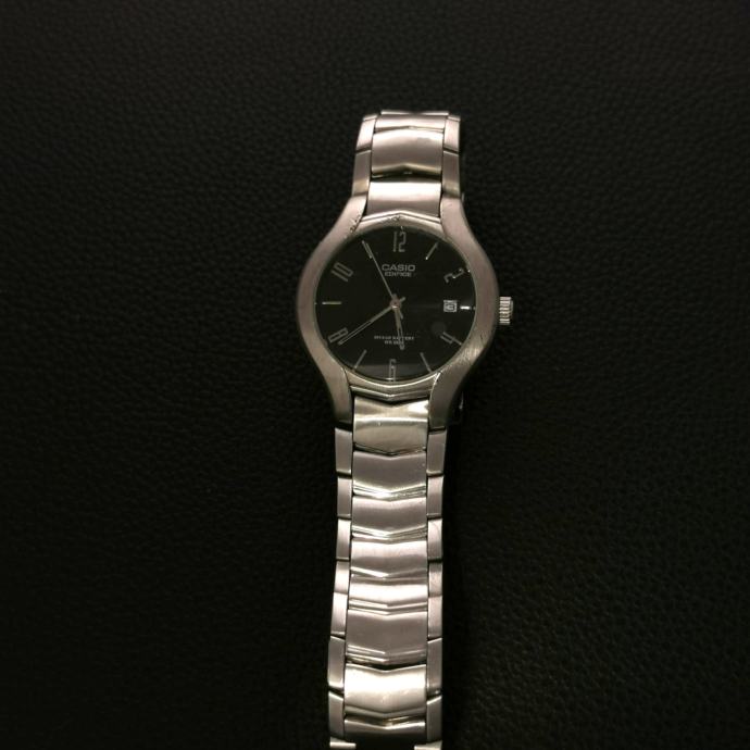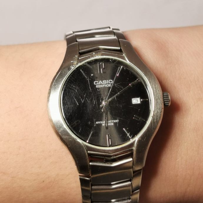 Na prodaju Casio Edifice EF-107 s crnim brojčanikom i datumom na 3h. Jednostavan, pregledan sat za svakodnevnu upotrebu. Prema fotografijama vidljivi su tragovi nošenja.