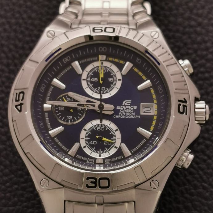 Ključne riječi: Casio, Edifice, ručni sat, analogni sat, kronograf, datum, WR100M, 10 bar, nehrđajući čelik, metalna narukvica, plavi brojčanik, sportski sat, muški sat, 24h podbrojčanik