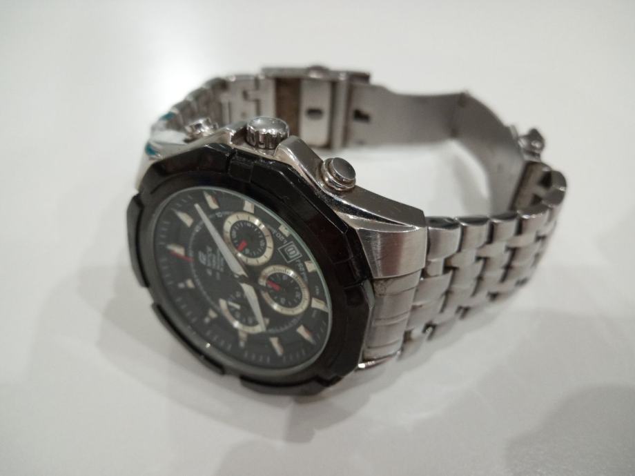Analog: 3 hands (hour, minute, stopwatch seconds), 3 dials (timekeeping second, 24-hour, stopwatch minutes)