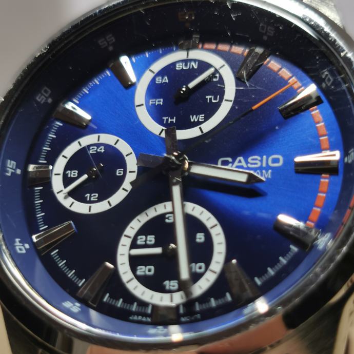 Vizualno: na staklu se vide sitne ogrebotine; kućište ima tragove nošenja/ogrebotine po rubovima