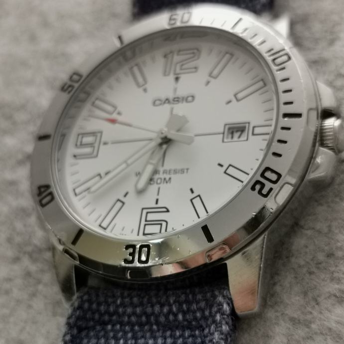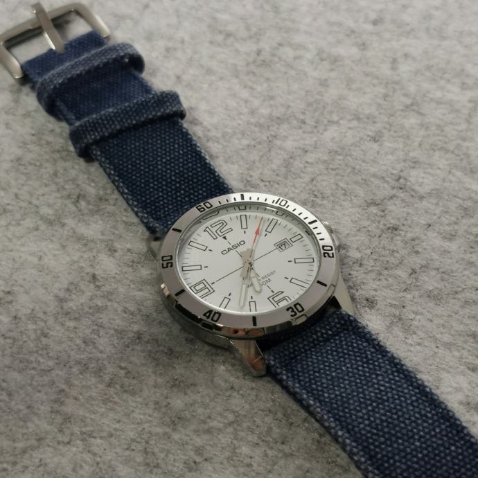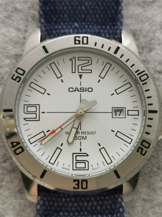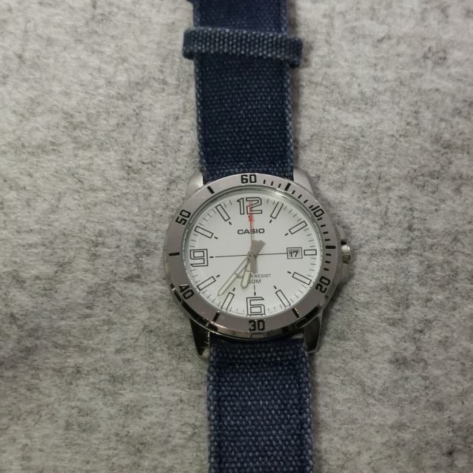 KEYWORDS: casio, mtp-vd01, 5058, quartz, muški sat, 42mm, bijeli brojčanik, datum, water resist, 50m, analogni, sportski, casual, platneni remen, plavi remen, mineralno staklo, steel back