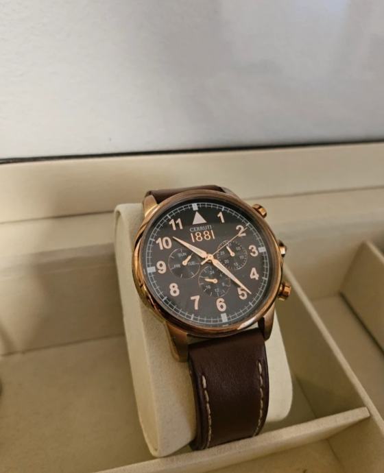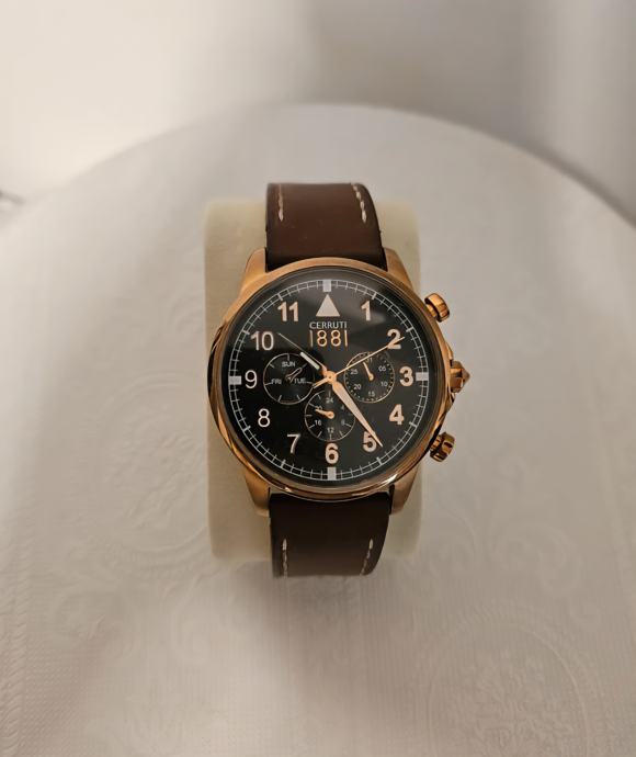 Men Watch CERRUTI TERRA CRA081C223G Brown leather strap Steel and 18k gold case, black dial Quartz Movement Case diameter: 43 mm Water resistant to 50 m