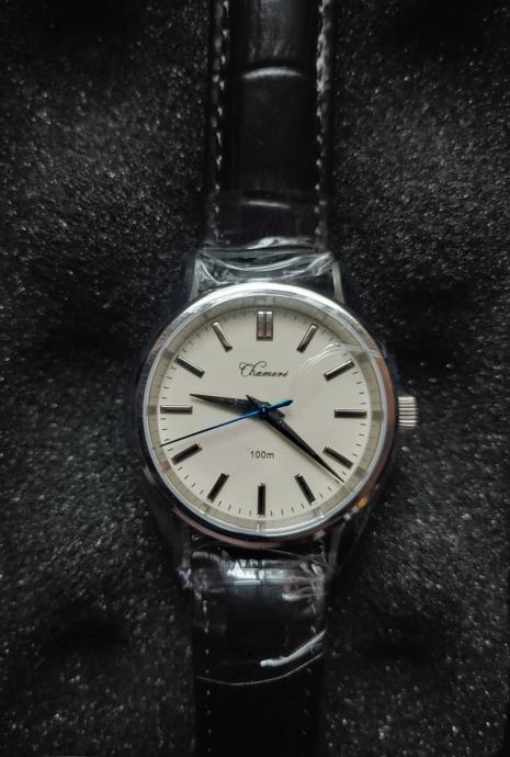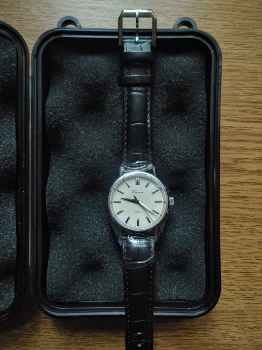 Prodajem elegantni muški sat Chameri GS02 s preciznim i pouzdanim japanskim mehanizmom Seiko VH31 kojemu se sekunde pomiču slično kao kod mehaničkih satova (4 puta u sekundi). Inace je to hommage King Seiko sata iz 70-ih. Jako je lijepo poliran i na nekim mjestima fino brušen. Sat ima krem brojčanik s jednostavnim, minimalističkim dizajnom. Kožna narukvica u crnoj boji daje klasičan dojam. Idealan dress watch za malu cijenu. Dolazi u zaštitnoj kutiji. Sat je novi, nekorišten i još se nalazi u original zaštitnoj foliji.