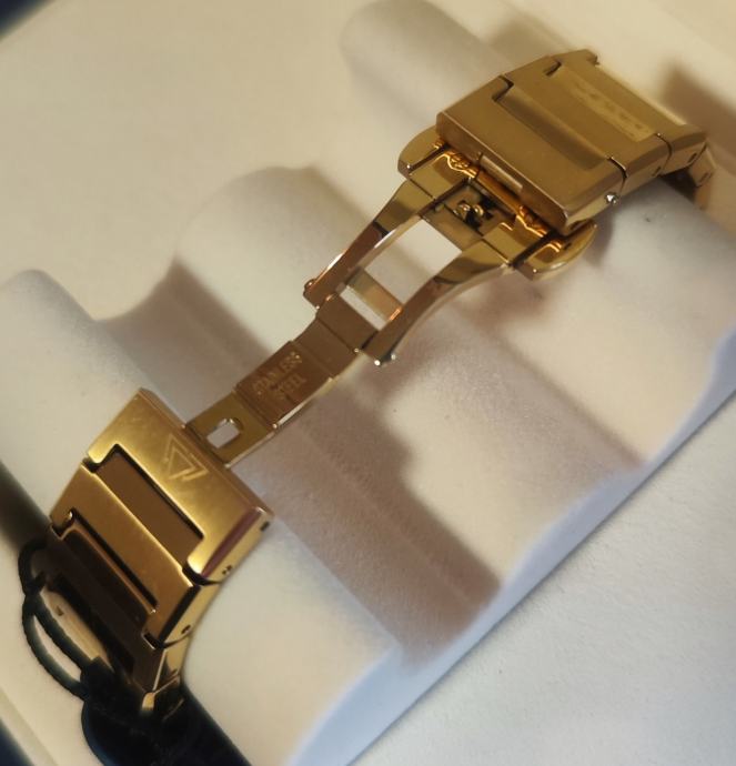 Kućište, narukvica i kopča od nehrđajućeg čelika u zlatnoj boji; kopča tipa leptir.