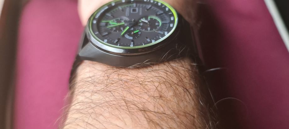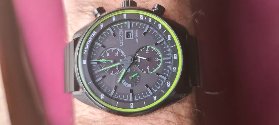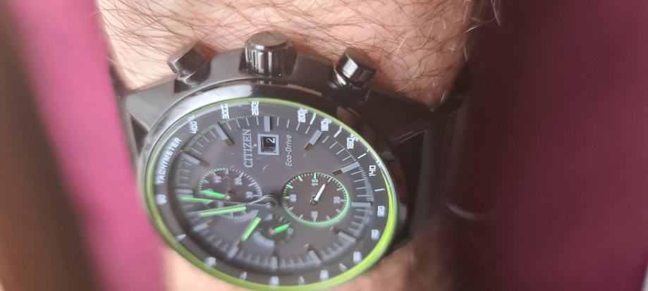 6 sati svijetla i mjesec dana može raditi u potpunom mraku.A nošenjem,godinama radi.Puni se i kod svjetla lampe.Zeleni rub i kazaljke po noći svjetlucaju.