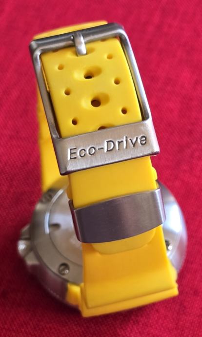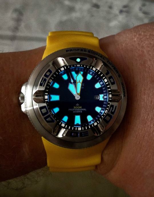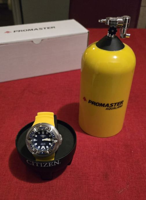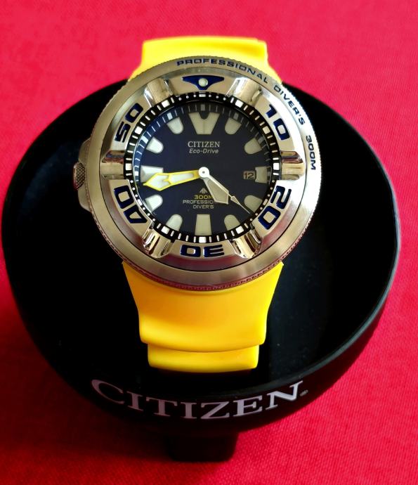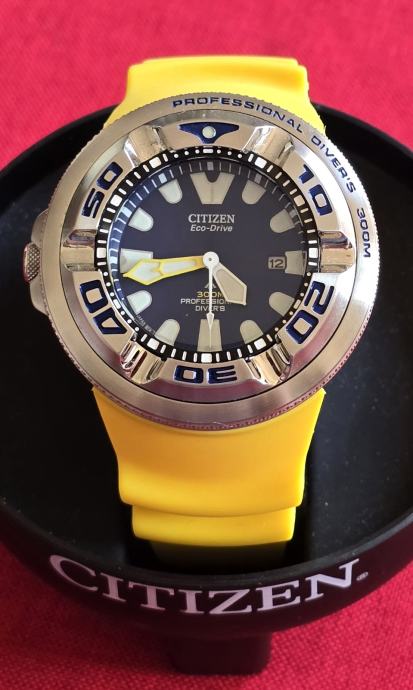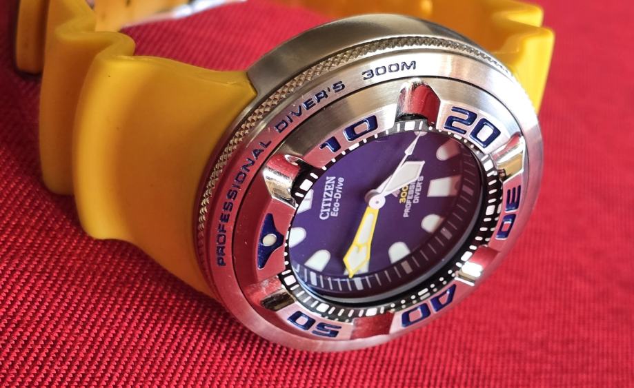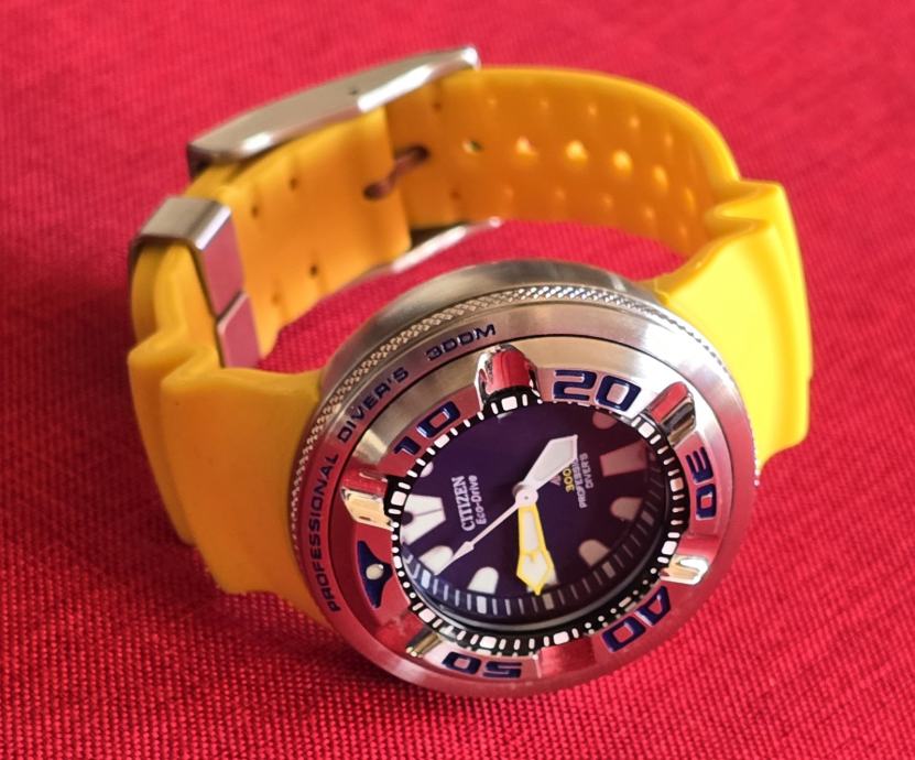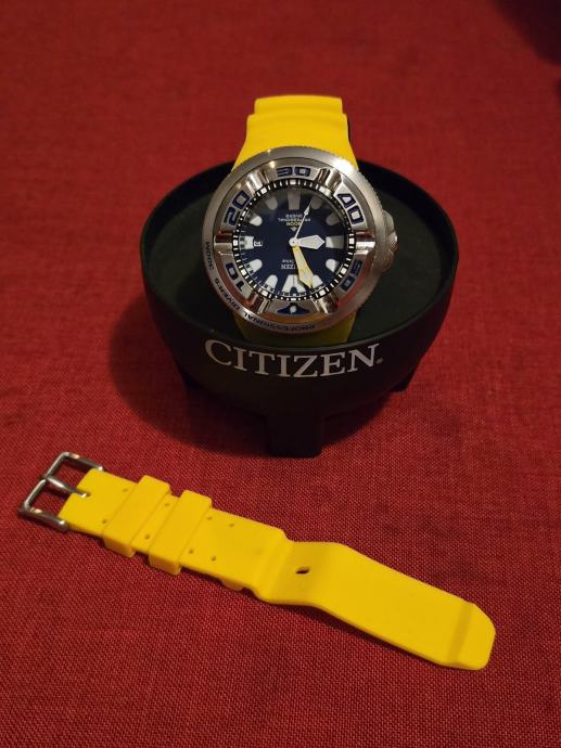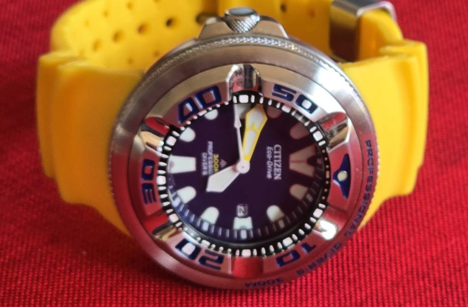 Rijedak primerak Citizen ekozilla promaster ronilačkog sata sa žutim remenom i plavim brojčanikom.