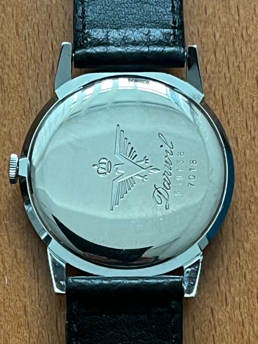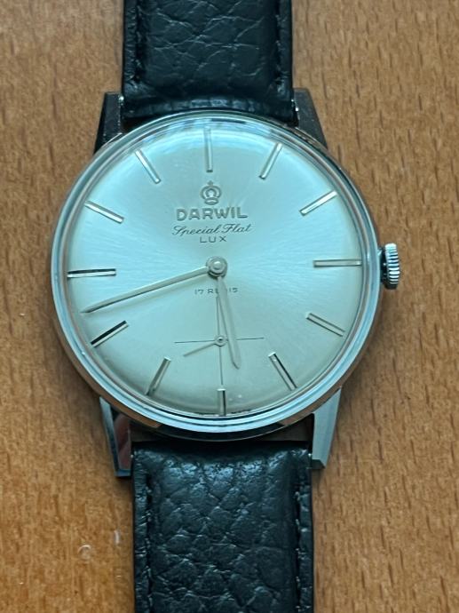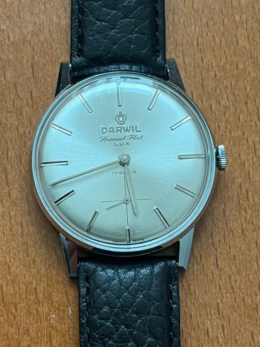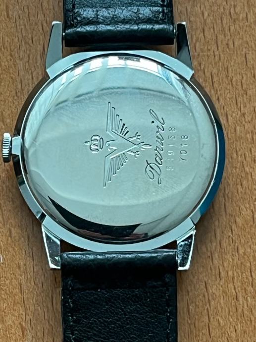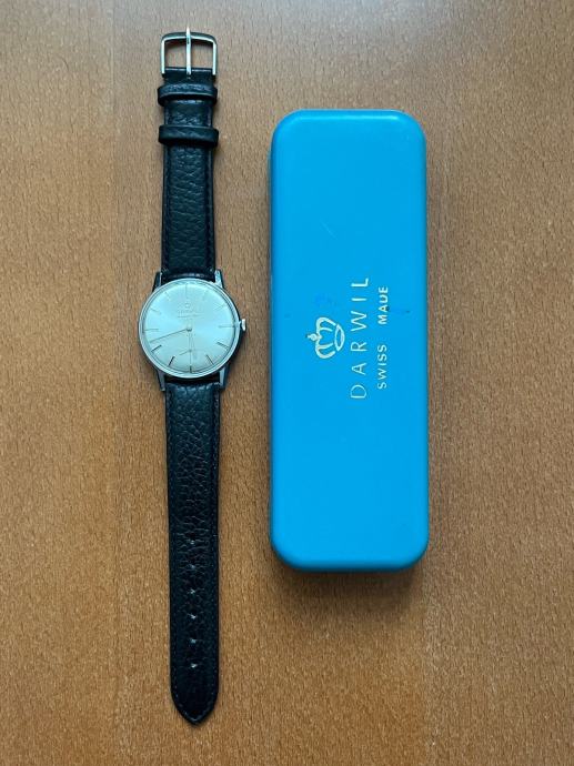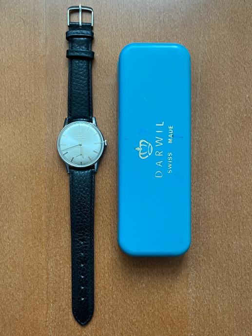 Prodajem muški ručni sat marke Darwil, NOS (new old stock) primjerak. Radi se o švicarskom satu s elegantnim srebrnim kućištem i crnim kožnim remenom. Sat dolazi s originalnom kutijom.