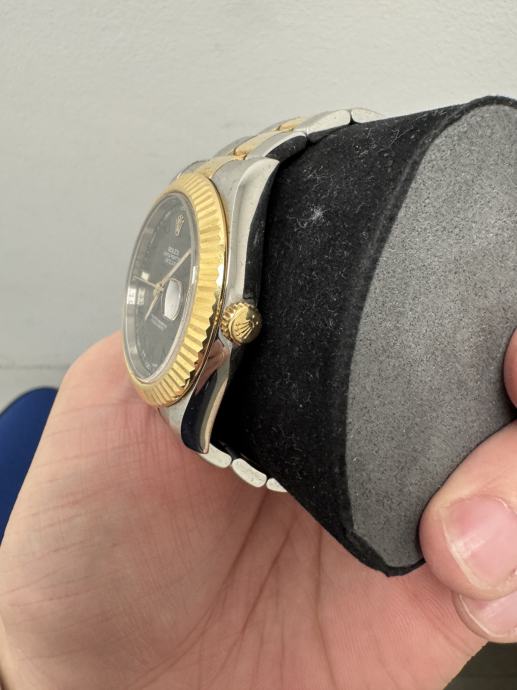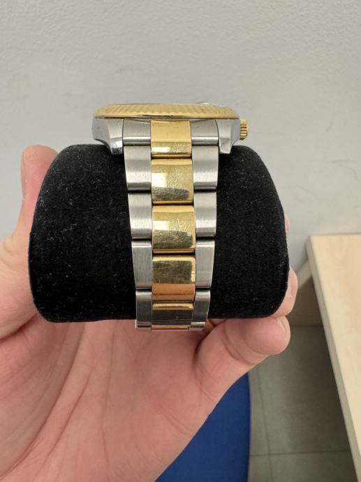 Kombinacija čelika i 18k žutog zlata, automatski mehanizam, sivi brojčanik sa rimskim brojevima, datum na 3h poziciji.