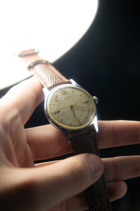 Prodajem stari sat Doxa Jumbo iz 60-ih godina. Sat je u potpunosti ispravan i točan, servisiran i očišćen, no trebalo bi promjeniti staklo prije nošenja.