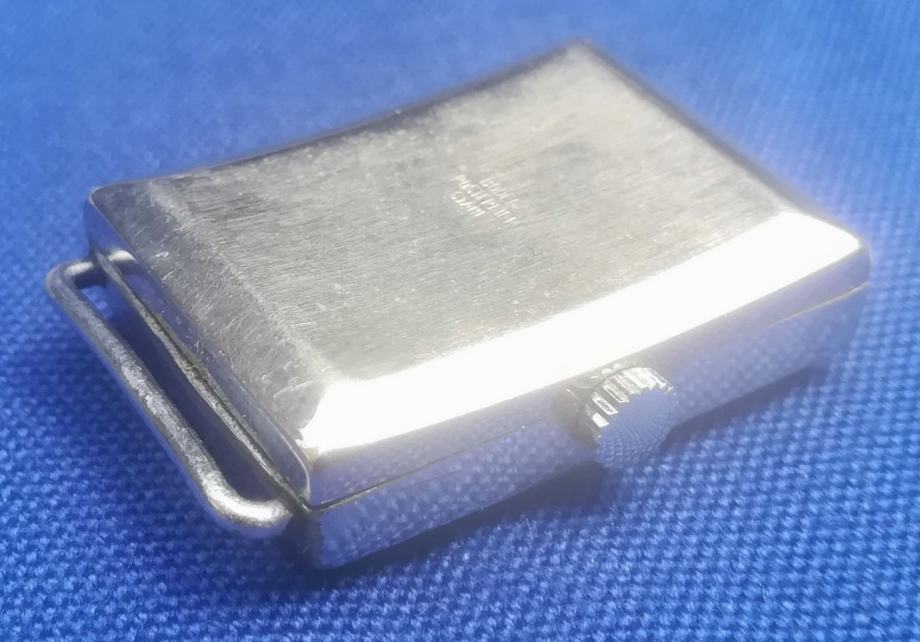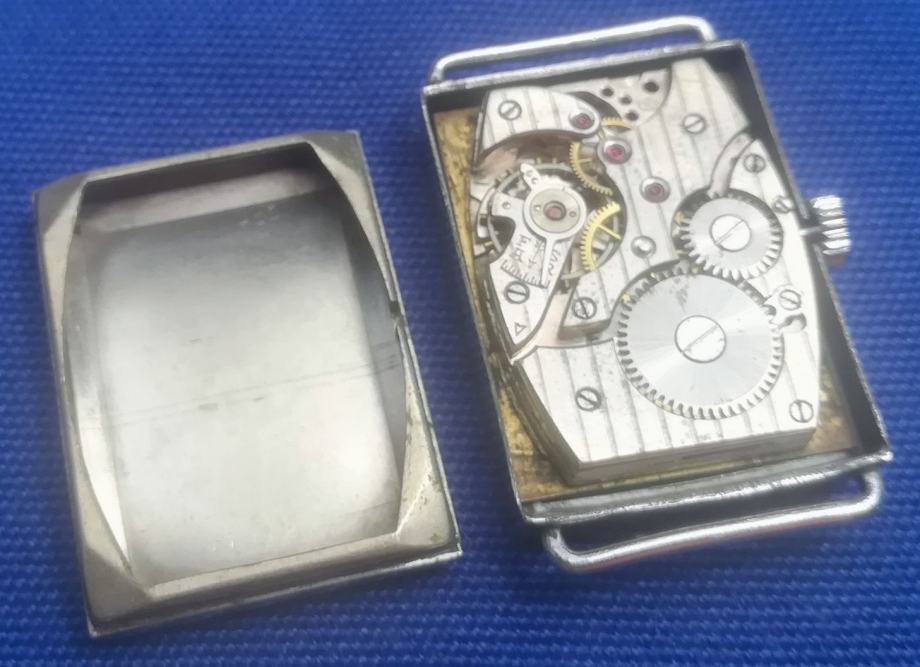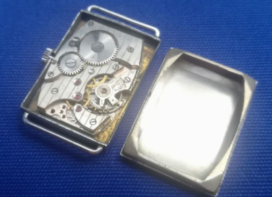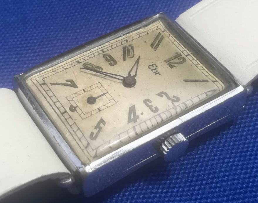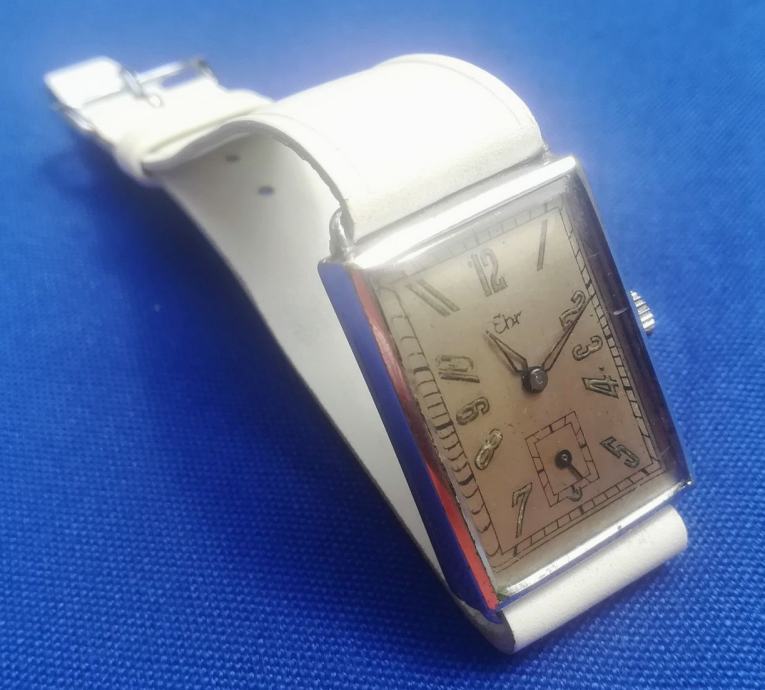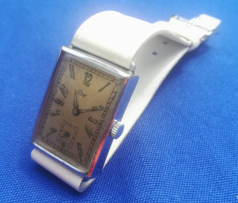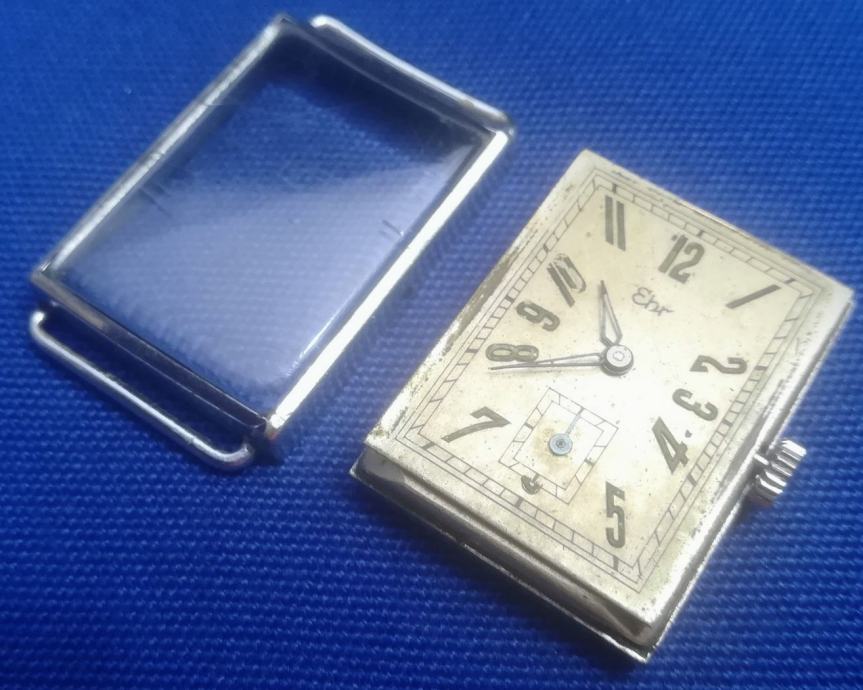 Art deco tkz Tank forma, ručni sat EHR - Karl Ehrmann proizveden u Pforzheimu, Njemačka, registriran 14. rujna 1942 ; mehanizam za ručno navijanje u ispravnom radnom stanju, očišćen i podmazan prije nekoliko mjeseci ; kućište od čelika ima dimenzije 22 x 30 mm (mjereno bez krunice) ; zamjenski kožni prolazni remen iz jednog komada (model kakav se koristio u ono doba) ; u izvornom originalnom i dobrom stanju kao što je prikazano na fotografijama ili bolje u živo. Vrlo rijedak ručni sat za kolekcionare!
