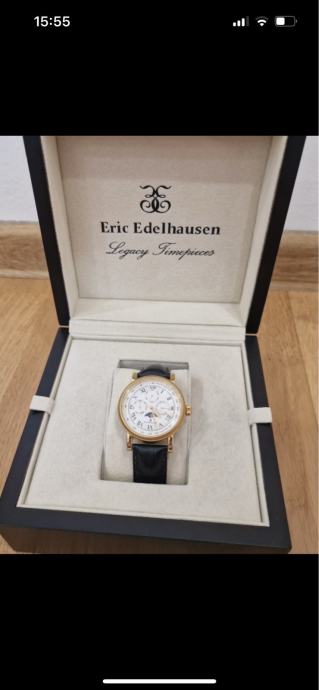 Eric Edelhausen Calypso 18K pozlata,sat kupljen u Dohi,full set.Svi chronometri u funkciji.Prelijep sat,kožna originalna narukvica,kao kopča i krunica.39mm velicina bez krunice.Vodootpornost 50m.