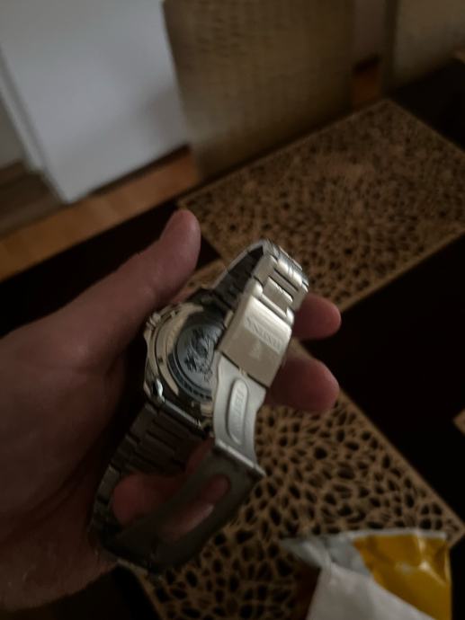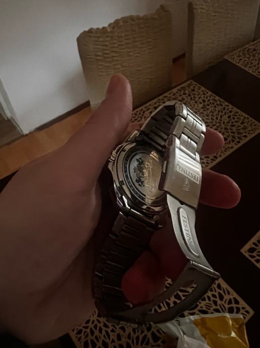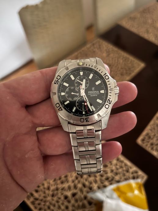 Prodajem muški sat marke Festina s kronografskim brojčanikom u crnoj boji i srebrnom metalnom narukvicom od nehrđajućeg čelika. Sat ima nerotirajući lunetu s oznakom do 60 minuta te višestruke brojčanike karakteristične za kronograf model. Mehanizam je kvarcni, a kroz prozirno dno kućišta vidljiv je strojni dio sata. Kućište je robusnog dizajna, prikladnog promjera za muški zglob.