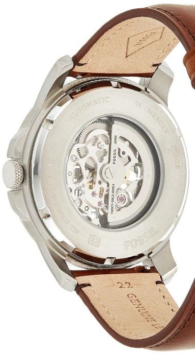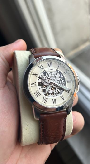 Fossil Grant Automatic ME3099, muški automatski sat, sa skeleton brojčanikom koji omogućuje pogled na unutarnji mehanizam. Kućište od nehrđajućeg čelika promjera 44mm, mineralno staklo, smeđi kožni remen.