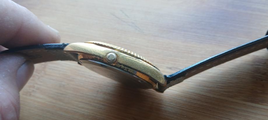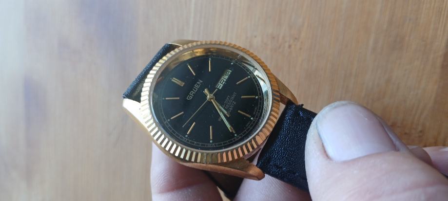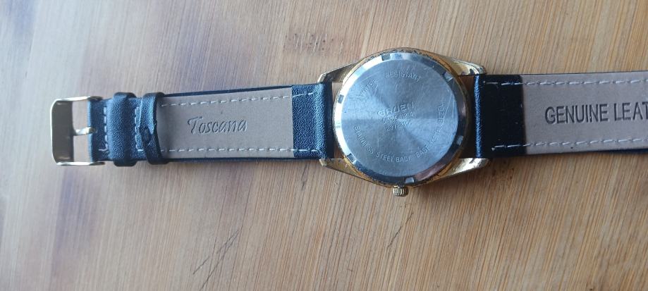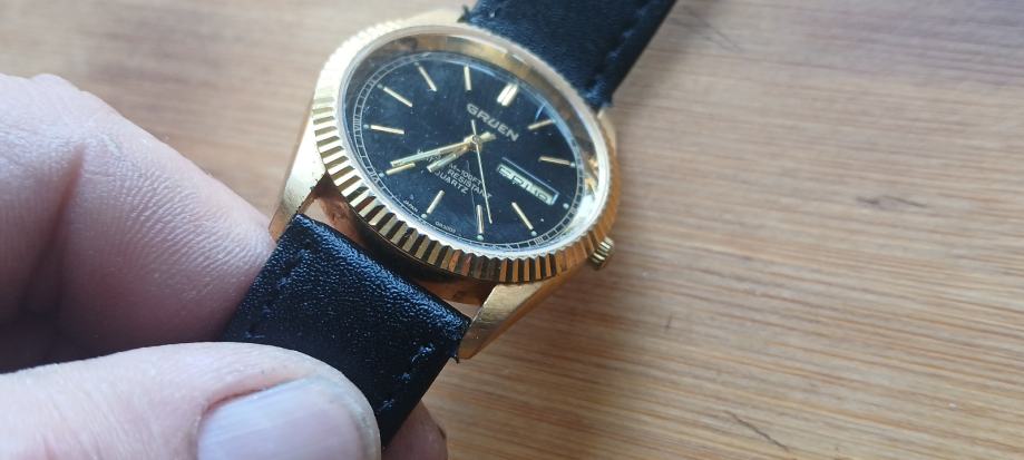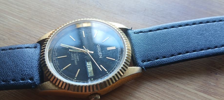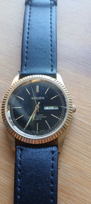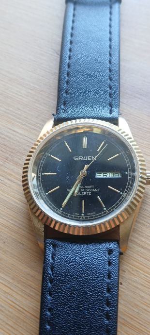 Gruen quartz, 237-2105,dan i datum ispravan i u dobrom stanju muski sat.Stavljena nova kvalitetna baterija i novi kozni remen.