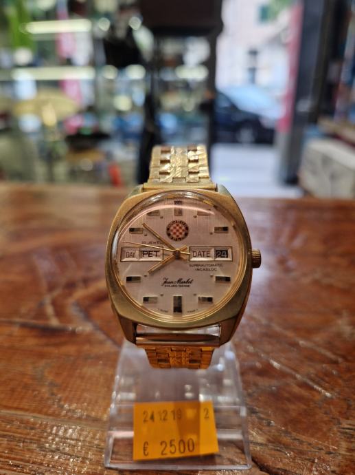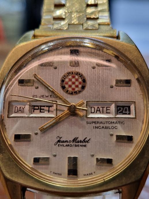 Prodajemo Fean Marbot evilard/biljne day-date super automatic incabloc sat koji je napravljen od strane iseljenika 1971. za 60 godišnjicu Hajduka. Sat je ispravan, servisiran. Unikatan je radi pozicija natpisa na pločici i radi remena.