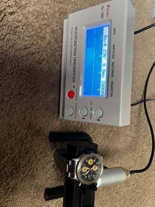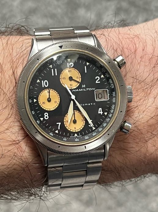 Sat je dio Hamiltonove kolekcije Lancaster iz sredine 80. godina prošlog stoljeća. Nosi se predivno u kućištu promjera 39mm i debljine svega 12mm (skoro pa nestvarno za automatski kronograf). Sat je servisiran krajem 2025. u Slowatchu, potvrdu nažalost ne posjedujem, ali na drugoj slici se vidi točnost i amplitude sata (+-0 sekundi na dan, amplitude oko 290). Savršeno resetira na nulu.