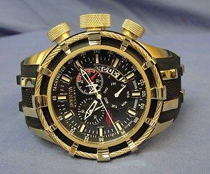 The Invicta Men's Reserve Collection Chronograph 18k Gold-Plated and Black Rubber Watch takes nautical style to elegant heights. This limited anniversary edition timepiece displays a black mother-of-pearl dial with luminous gold-tone hands and indexes at all hour positions. The 18k gold-plated stainless steel case shines against the black rubber strap with 18k gold-plated inserts. A unique bezel of 18k gold-plated rope adds class and character. The analog display features a tachymeter, chronograph functions with 60-second, 30-minute, and day subdials. The date is displayed at the four o'clock position. Invicta has created a lasting timepiece with precise, high-quality Swiss quartz movement and a durable flame-fusion crystal. This watch is water resistant to 660 feet (200 meters).