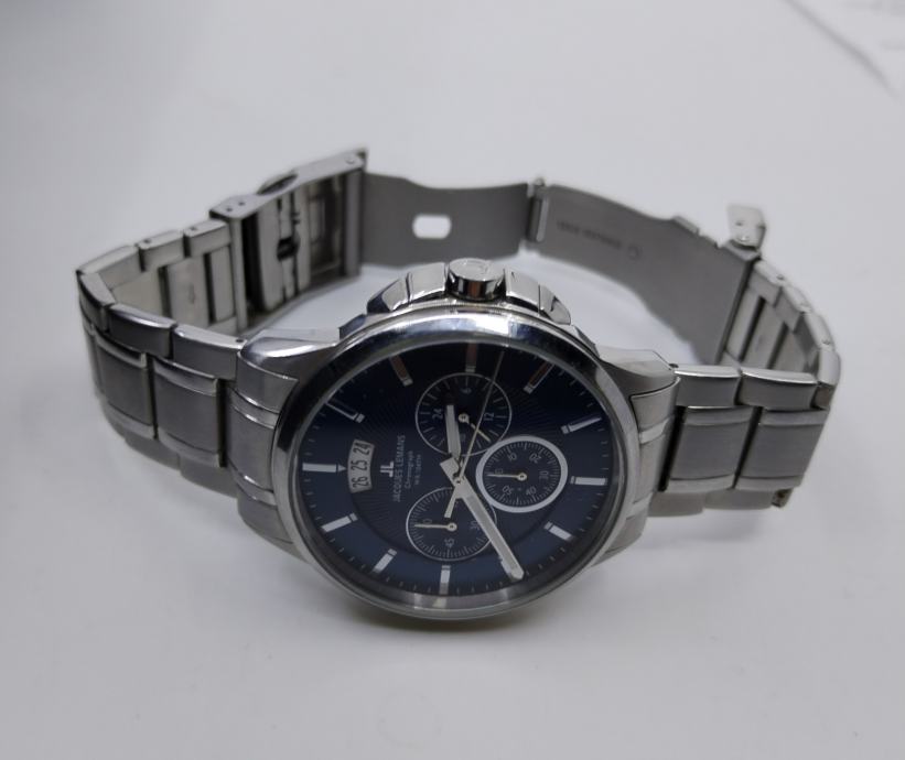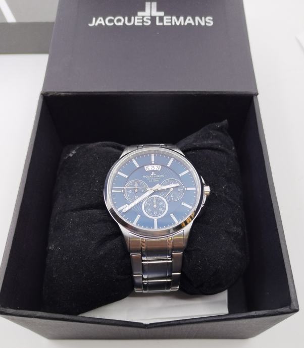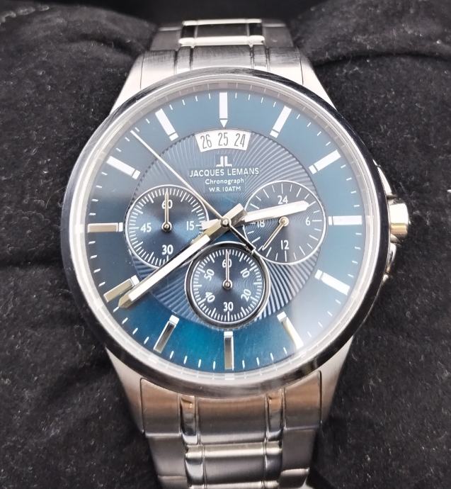 Prodajem muški sat Jacques Lemans kronograf s plavim brojčanikom i metalnom narukvicom srebrne boje. Radi se o kronografu s prikazom datuma i više podciferblata, vodonepropusan do 10 ATM. Sat dolazi u originalnoj Jacques Lemans kutiji.
