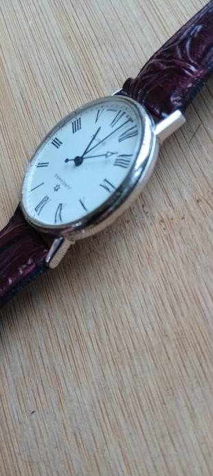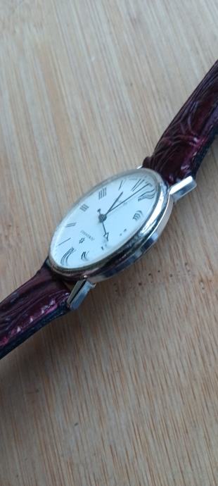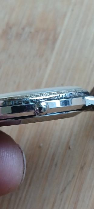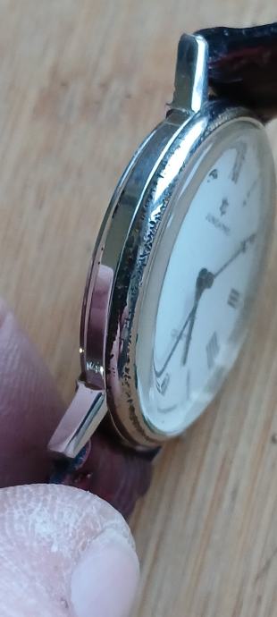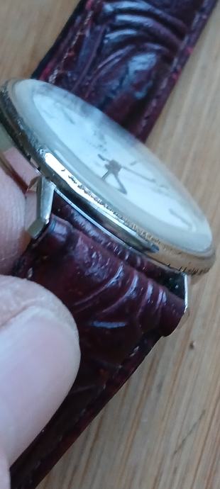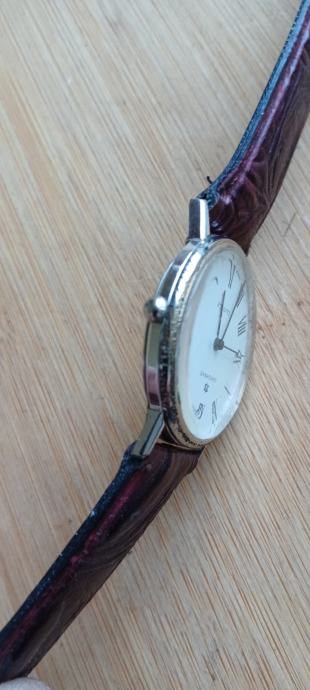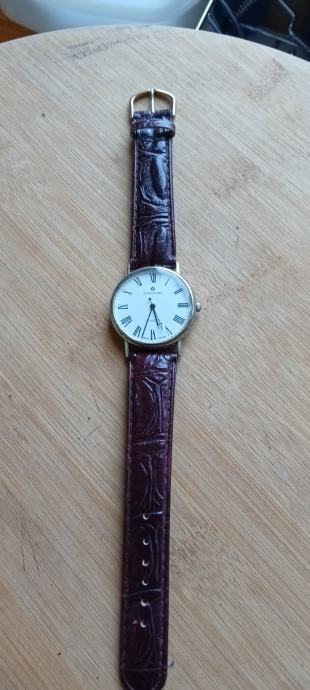 Muški sat promjera 34 mm jsprsvan i točan,elegantan dizanj kojeg narušuju oštecenja na kučistu,nova urarska baterija,dobar remen šaljem tisak,pošta,njuškali