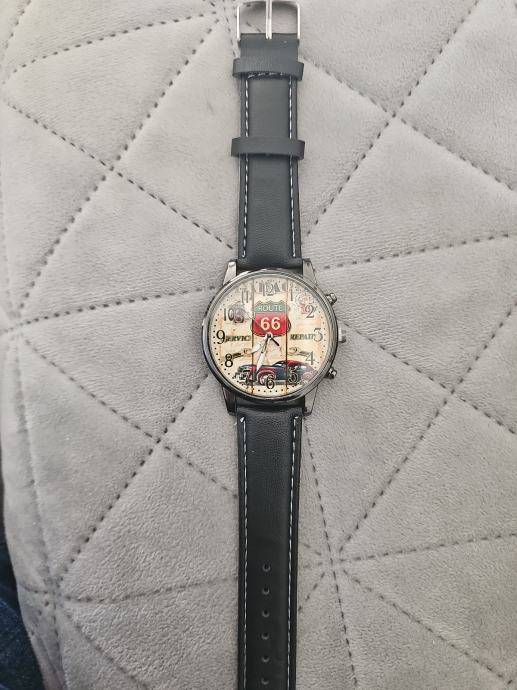 Prodajem kvarcni analogni sat s upečatljivim dizajnom. Brojčanik ima vintage motiv s temom Route 66, s ilustracijom starog automobila i karakterističnim znakom autoceste u crvenoj boji. Kućište je crne boje, a sat dolazi s crnim pu kožnim remenom. Stanje je novo bez etikete.