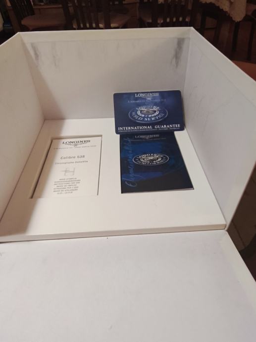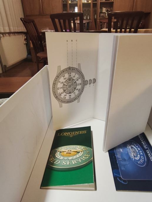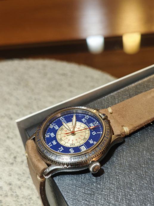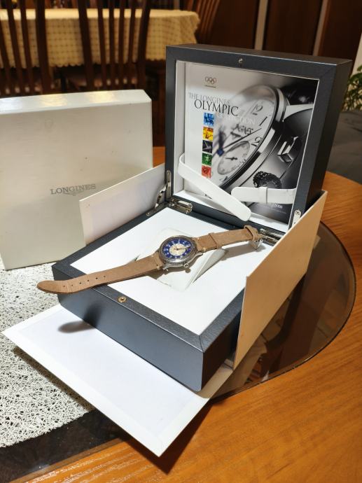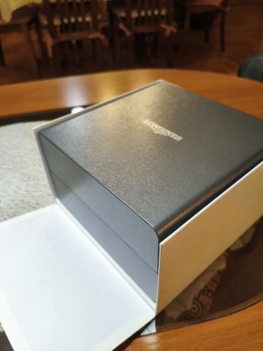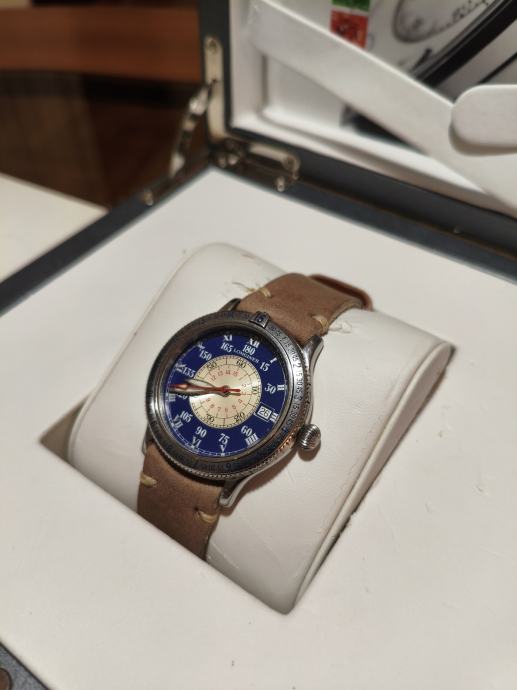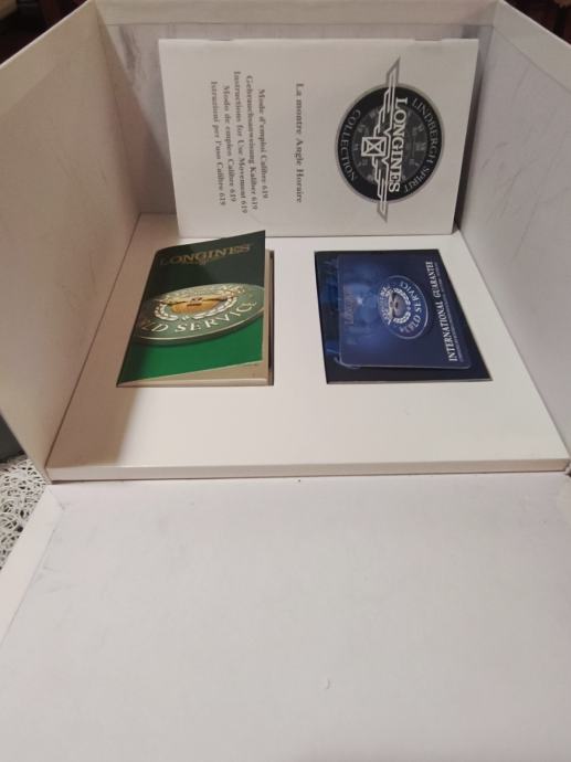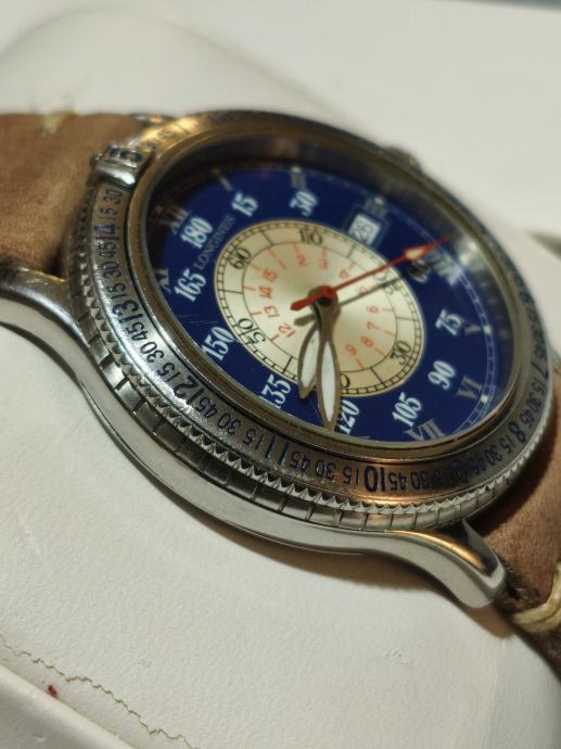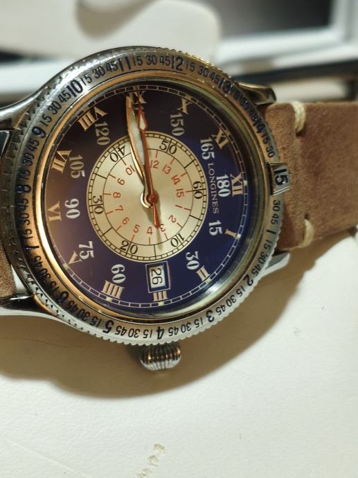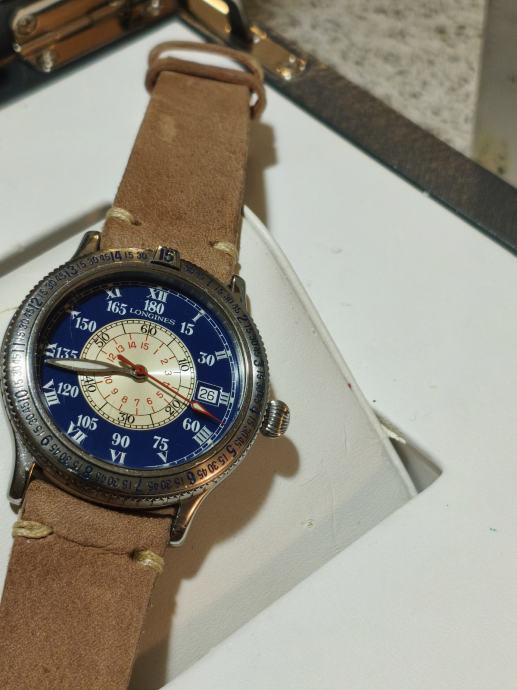 Prodajem Longines Lindbergh Hour Angle automatski sat, poznat po svom specifičnom dizajnu inspiriranom navigacijskim instrumentima. Sat dolazi s karakterističnim plavim vanjskim prstenom s ugraviriranim kutnim oznakama, kremastim središnjim brojčanikom s rimskim brojevima, te narančastom kazaljkom sekunde. Narukvica je od smeđe kože. Kućište je izrađeno od nehrđajućeg čelika, a sat ima i prikaz datuma.
