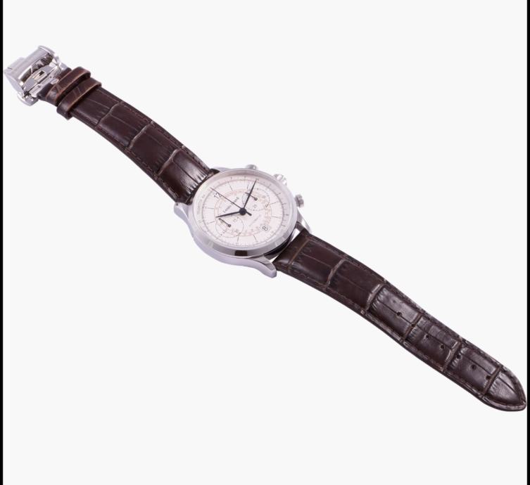 Kućište od poliranog nehrđajućeg čelika, krem brojčanik s crveno-smeđim i crnim oznakama, otvorena poleđina i antirefleksno safirno staklo s obje strane definitivno odišu elegancijom i modernim stilom. Luksuzni smeđi remen s uzorkom krokodilske kože i preklopna kopča od nehrđajućeg čelika upotpunjuje vintage izgled i dojam. Značajke uključuju automatski mehanizam ETA 7753, kronograf čiji se brojači preklapaju sa skalama tahimetra i telemetra, 27 rubina, rezervu snage od 48 sati, vodootpornost do 50 metara, prozorčić s datumom na 6 sati, brojač minuta i male sekunde. Sat je pažljivo održavan i u vrlo je dobrom stanju, s laganim znakovima korištenja na kućištu i kopči. Sat dolazi s kutijom i papirima sat ja doslovno ne nošen kao nov bez crtice..