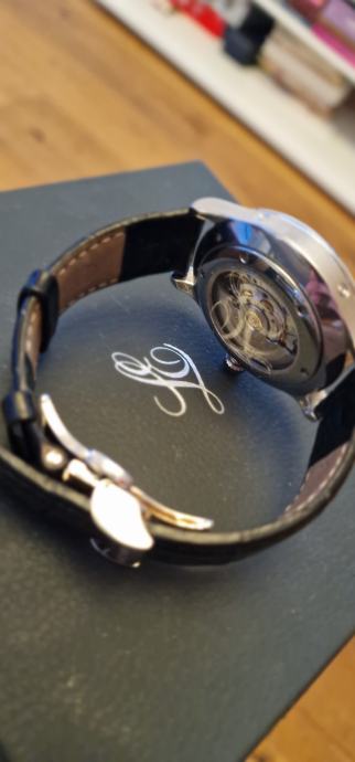 Skeletonizirani brojčanik: Prozirni dizajn omogućuje pogled na zupčanike i rad mehanizma direktno kroz prednju stranu sata.