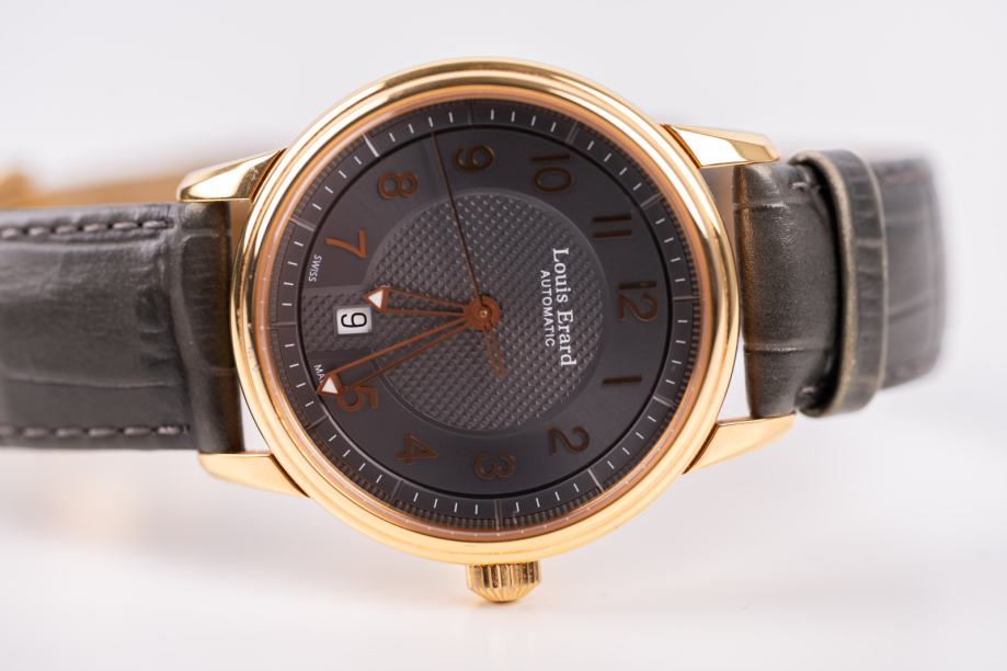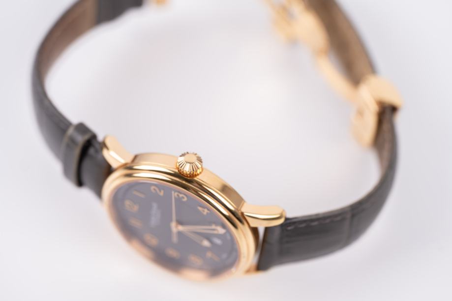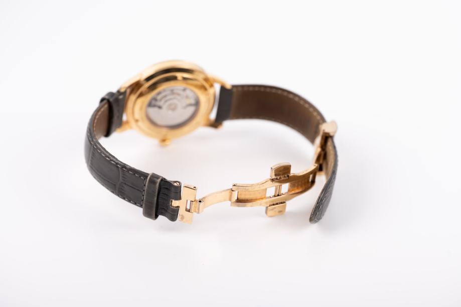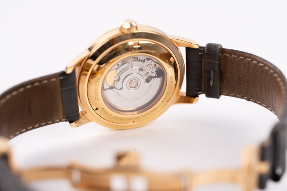 Automatik ETA mehanizam, stakleni poklopac, gold kućište, kožni remen