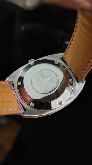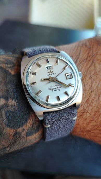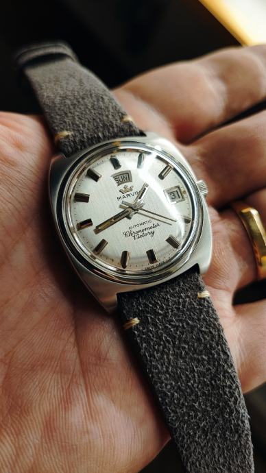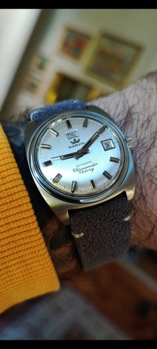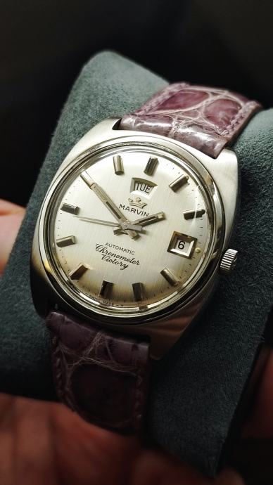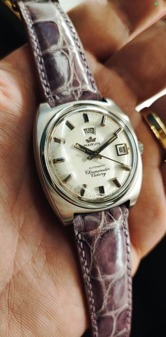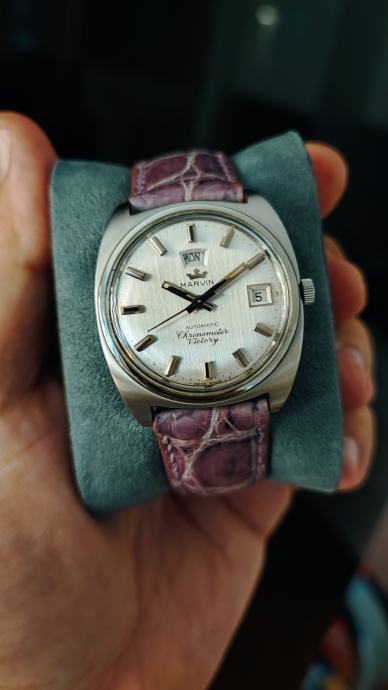 Prodajem iznimno rijedak sat Marvin Chronometer Victory Day Date iz 60tih. Ovaj model nije na prodaju na niti jednom oglasu u svijetu trenutno i osobno ga nikada nisam vidio u prodaji. Automatic mehanizam, 36mm, nova custom kožna narukvica sa originalnom kopčom, originalna krunica, originalna kutija sa garancijom iz 60tih. Sat je u fenomenalnom estetskom i radnom stanju. Zamjene me ne zanimaju. Hvala!