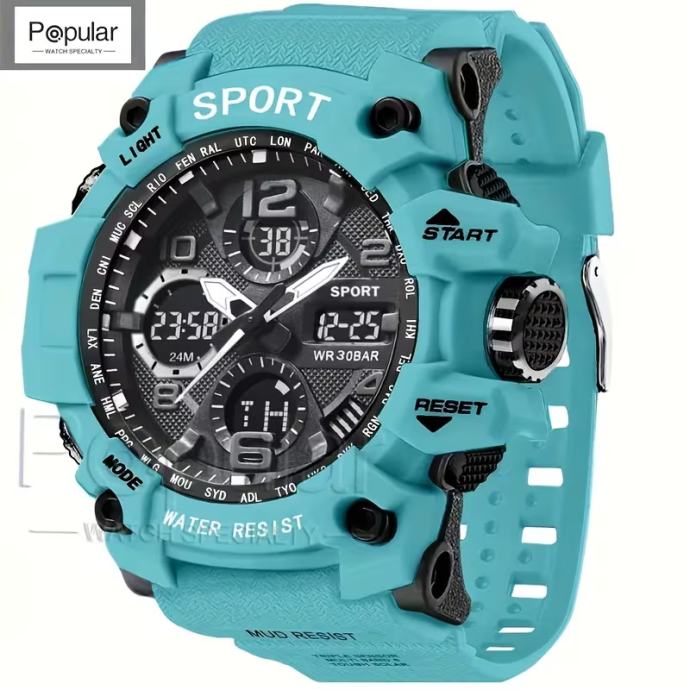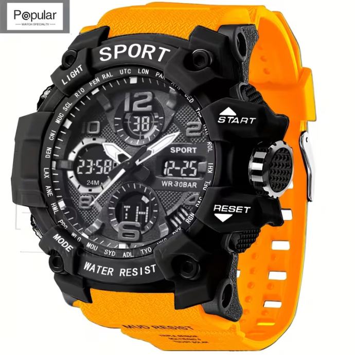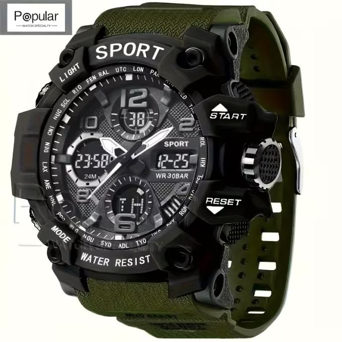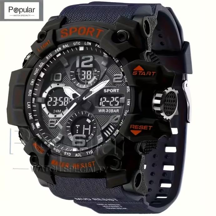 Moderni sportski satovi za muškarce , s višenamjenskim LED budilnikom otpornim na udarce, štopericom i kvarcnim ručnim satovima. Idealni za aktivnosti na otvorenom, ovi satovi s dvostrukim zaslonom savršeni su za stil života.