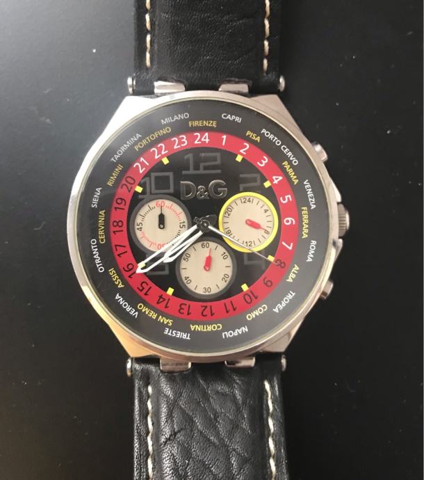 Prodajem original muški ručni sat D&G u izvrsnom stanju. Sat ima masivno čelično kučište s atraktivnom crno crvenom podlogom.