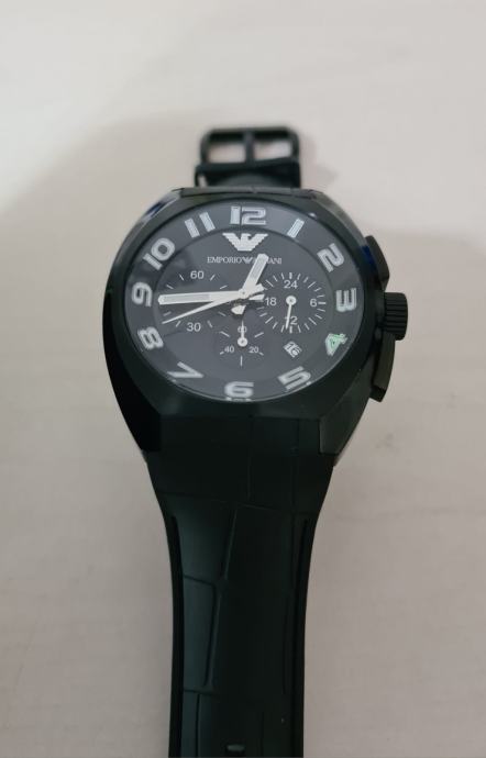 Prodajem muški sat Emporio Armani AR5846 u crnoj boji. Radi se o kronografu s crnim brojčanikom, bijelim arapskim brojevima i tri podmjerača. Kućište je od nehrđajućeg čelika s crnim PVD premazom, a narukvica je od crne gume/silikona s teksturiranim uzorkom. Sat je vodootporan do 100 metara / 10 ATM.