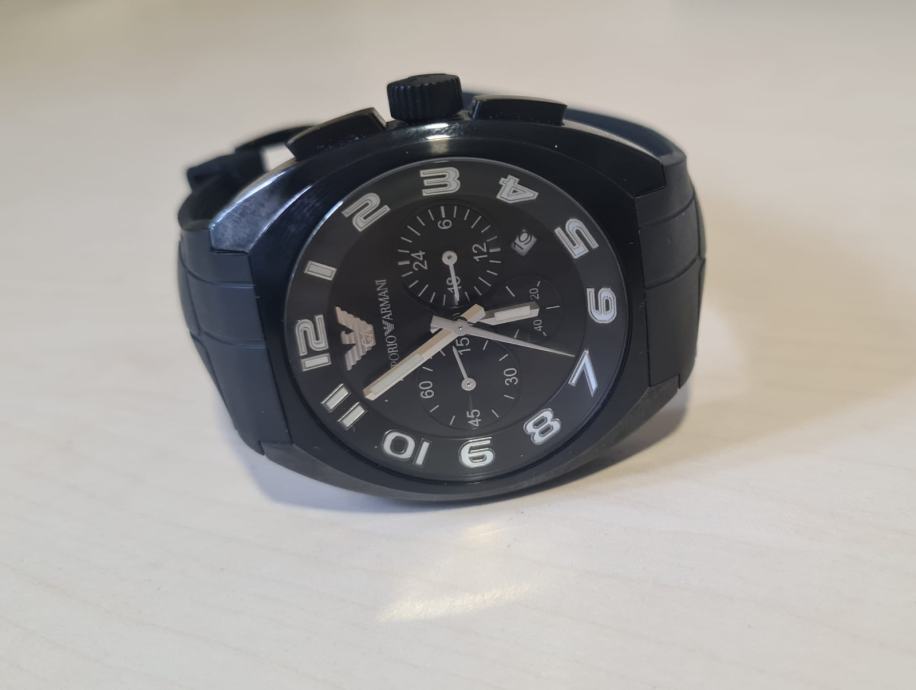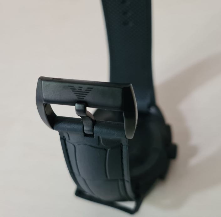 Prodajem muški sat Emporio Armani model AR5846 u crnoj boji. Sat ima sportski dizajn s velikim brojčanim oznakama i kronografom. Kućište je crne boje, a narukvica je izrađena od gume. Brojčanik je crn s tri dodatna mala brojčanika za mjerenje vremena.