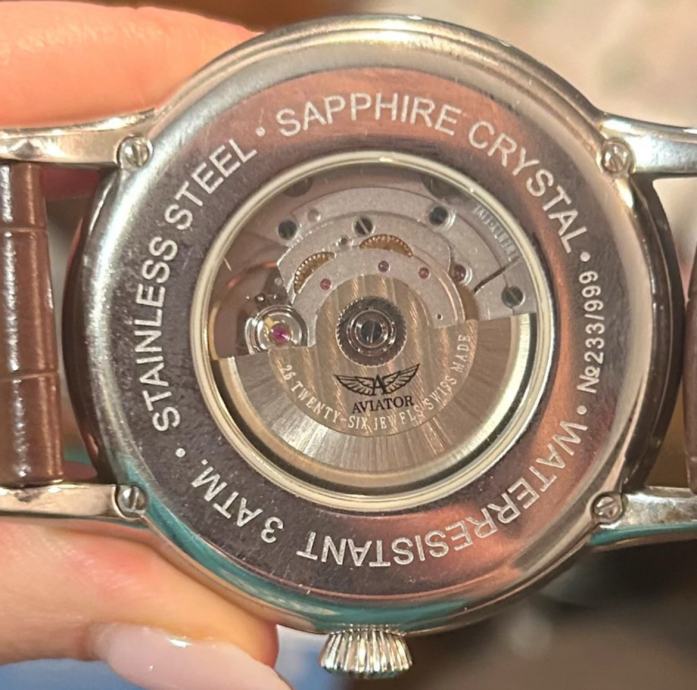• Stražnja strana kućišta: Transparentna (exhibition caseback) sa safirnim staklom – omogućuje pogled na precizan automatski mehanizam