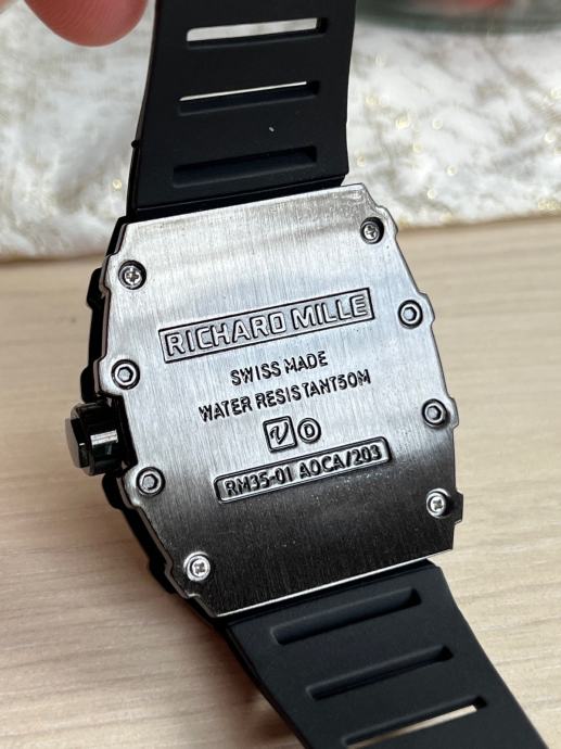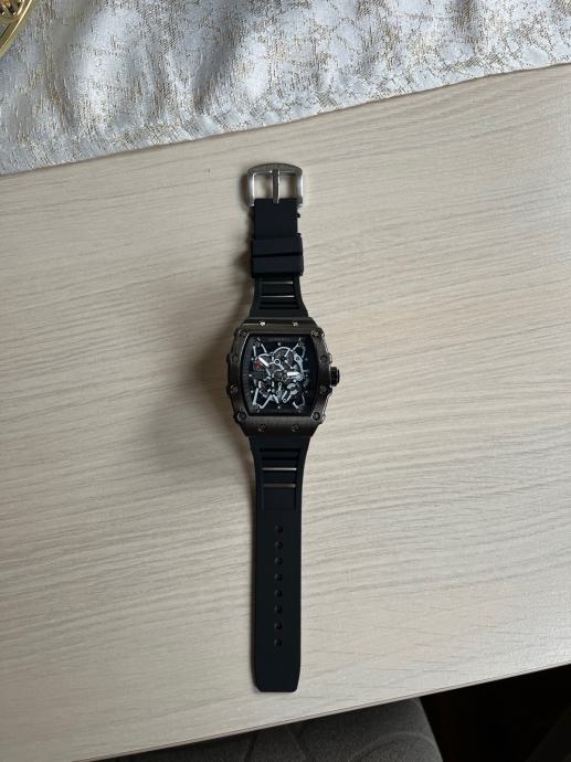 Prodajem muški sat s automatskim mehanizmom i skeleton brojčanikom kroz koji se vidi unutarnji mehanizam. Kućište je pravokutnog oblika u crnoj boji s karakterističnim vijcima na rubovima, a narukvica je izrađena od crne gume. Sat ima sportski dizajn s vidljivim detaljima mehanizma i crvenim naglaskom nakazaljci. Sat svijetli u mraku.