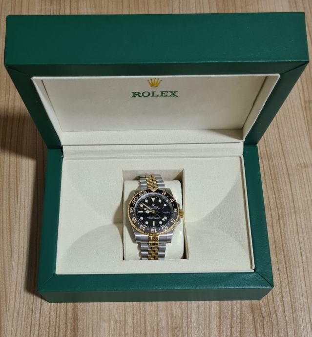 Prodajem muški sat, repliku Rolexa GMT-Master II, kombinacija srebrne i zlatne boje s crnom keramičkom lunетом. Sat dolazi s Jubilee narukvicom u dvobojnoj izvedbi te crnim brojčanikom s karakterističnim bijelim točkicama i zlatnim kazaljkama. Dolazi s kutijom ili bez