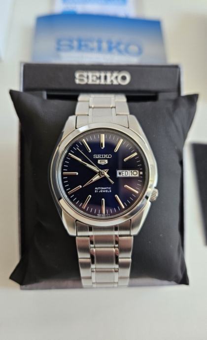 Prodajem muški sat Seiko 5 SNKL43K1 s automatskim mehanizmom. Sat ima tamno plavo-crni brojčanik i prikazom dana i datuma. Narukvica i kućište izrađeni su od nehrđajućeg čelika srebrne boje. Dolazi s originalnom kutijom i jamstvenim listom, te dodatnim karikama za narukvicu.